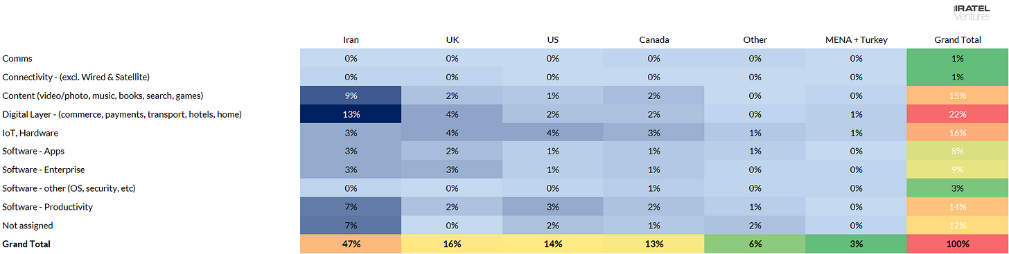 The numbers in each cell represent the percentage of grand total, not each column. For example, Digital Layer in Iran is 13% of the total deal flow and almost a quarter of all deals in Iran.