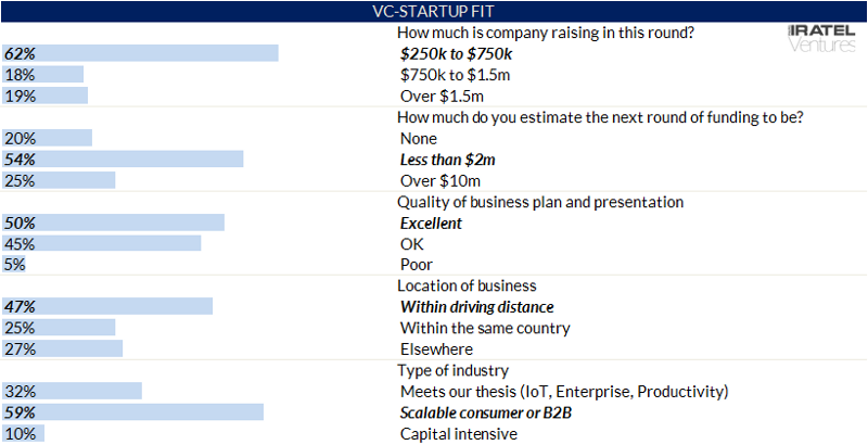We call this following data point VC-Startup fit since we sometimes see deals that are too large or too small or we don’t feel there is a good match. However, the majority of the startups we see fall in the right range of raising between $250k and $750k and plan to reach breakeven within 36 months.