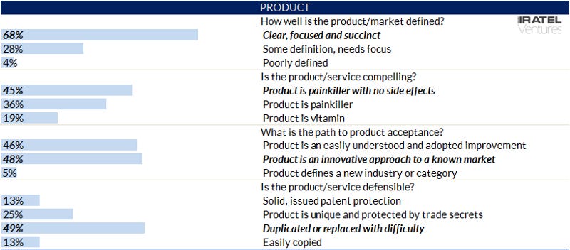 We always like to see product demos but occasionally see pre-product startups. Of those who have a product, the majority have a clear and focused view. On the other hand not many claim that they need patents to make their startup defensible and rely on the trade secrets and sheer volume of work that has gone into building a product to fend off competition. Only a minority plan to defend their IP through patents.