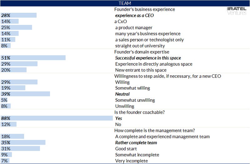 Now let’s take a closer look and see how these startups are being evaluated. Teams are the most important aspect of any startup. The majority of the startups we see are founded by ex-CEOs or product managers. Very few are straight out of university. Only 18% have a complete and experienced management team, this is an area that we need to work on.