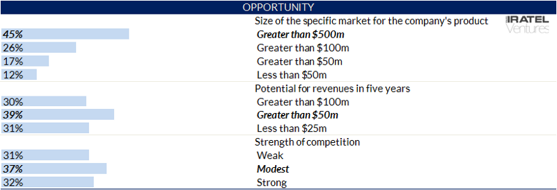 From an opportunity point of view, naturally entrepreneurs are optimistic and nearly half estimate their market size to be above $500m. Ideally, there are cases that the entrepreneur doesn’t know what their market size is yet because they’re going to create it.