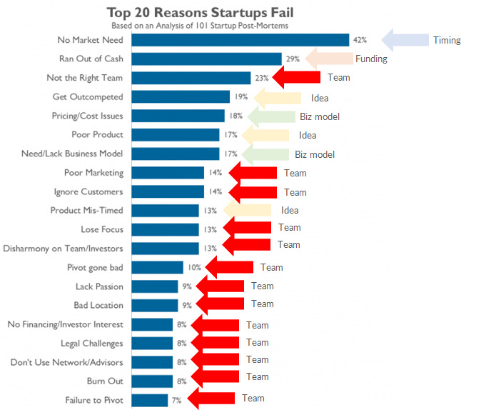 I would argue that the reason most startups fail is due to team and human elements. Looking at the list above, you can group 13 of the 20 into team:
